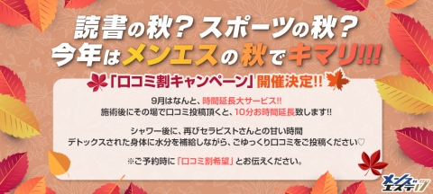読書の秋📚?スポーツの秋🎾? 今年は🍁メンエスの秋🍁でキマリ!!! メンズエステ17 ”口コミ割キャンペーン” 開催決定!! 9月はなんと、時間延長大サービス!! 施術後にその場で口コミ投稿頂くと、10分お時間延長致します!! ~シャワー後に、再びセラピストさんとの甘い時間~ デトックスされた身体に水分を補給しながら、ごゆっくり口コミをご投稿ください♡ ※ご予約時に「口コミ割希望」とお伝えください