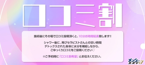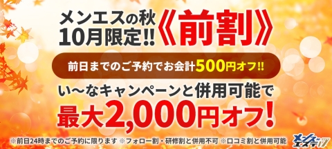 初めて当店を利用する方は最初どうしていいか分からないですよね? もちろん、エステ魂からもご予約可能なのですが まずはお電話でお問い合わせいただいた方がスムーズに 分かりやすくご説明いたします! 大丈夫!怖ーい男性が出るわけではありません! 電話に出るのはは優しい女性スタッフなので安心してくださいね♡ 『🍁メンズエステ17秋のい~なキャンペーン🍁』 アロマ・美魔女コース限定 1,500円OFF!!! キャンペーン期間:2023年10月1日(日)~10月31日(火)23:59 通常 キャンペーン価格 60分 9,000円 → 7,500円 75分 12,000円 → 10,500円 90分 15,000円 → 13,500円 120分 20,000円 → 18,500円 150分 24,000円 → 22,500円 180分 27,000円 → 25,500円 女性スタッフが丁寧に電話対応しますので、初めての方でもお気軽にお問い合わせください。 ご予約お待ちしております♡