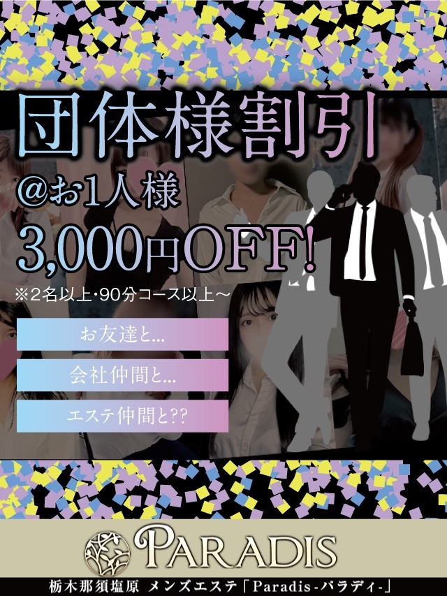 エステ番長 ご覧の皆様へ<br /><br />(●^o^●)お疲れ様です...パラディです🌴<br /><br />【団体様割引】のご案内ですよ♪<br /><br />▼2名以上で・90分コース以上~<br /><br />@お一人様、3,000円割引致します!!<br /><br />お友達同士・会社仲間さん・エステ同志さん???<br /><br />☆今すぐでも大丈夫です!(^O^)/<br /><br />(^_-)-☆是非『エステ番長 』見た!で、ご予約を...<br /><br /><br />▼事前予約受付中▼<br />https://esthe-paradis.com/contact.php<br /><br />(^O^)/❤超絶癒しのメンズエステを体感あれ!是非ご予約を♪<br /><br />---------------------------------------------------------------<br />▼那須塩原 メンズエステ▼ <br />お店:Paradis-パラディ-<br />HP:https://esthe-paradis.com/<br />TEL:070-2640-4256<br />営業時間:9:00~翌2:00 (受付終了)<br />---------------------------------------------------------------